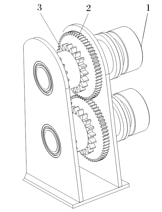 在現(xiàn)有研究的基礎(chǔ)上,本研究提出在連接兩鏈輪的軸上加一對同步齒輪。這樣不僅可以實現(xiàn)連續(xù)送繩,而且當兩液壓馬達輸出的轉(zhuǎn)速不同步時,可通過同步齒輪強制將兩軸轉(zhuǎn)速相同,從而實現(xiàn)兩鏈輪轉(zhuǎn)速同步,避免鋼絲繩打滑等問題。但這樣會導(dǎo)致同步齒輪受到較大的沖擊,如受到來自同步齒輪的相互擠壓,或液壓馬達輸出轉(zhuǎn)矩不穩(wěn)定時對齒輪的影響等,因此需要對同步齒輪進行進一步的分析。