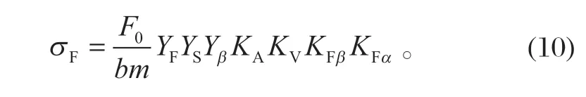 式中:YF 為齒廓系數(shù),YF=1;YS 為應(yīng)力修正系數(shù),YS=1;KA 為使用系數(shù),KA=1.25;KV 為動(dòng)載系數(shù),KV=1;KFβ 為螺旋分布系數(shù),KFβ=1;KFα 為載荷分布系數(shù),KFα=1。將各數(shù)據(jù)代入式(10),可得齒根彎曲應(yīng)力為100.42MPa。