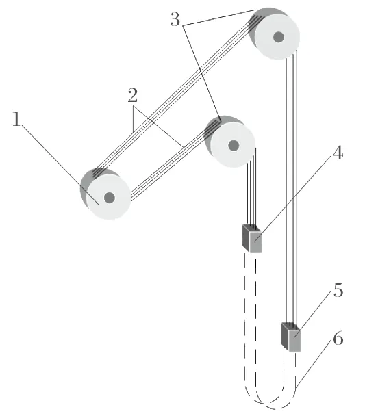 礦井多繩摩擦式提升機(jī)是我國(guó)礦井領(lǐng)域zui常用的提升裝備,主要用于提升人員、設(shè)備和物料。該提升系統(tǒng)主要由驅(qū)動(dòng)裝置、多根鋼絲繩、上下天輪及罐籠等部分組成,其結(jié)構(gòu)如圖1 所示。其中,驅(qū)動(dòng)裝置由電動(dòng)機(jī)、減速機(jī)和聯(lián)軸器等部分組成,可將電能轉(zhuǎn)變?yōu)闄C(jī)械能,實(shí)現(xiàn)對(duì)罐籠的提升和下放;上下天輪用于對(duì)鋼絲繩進(jìn)行改向。提升鋼絲繩在天輪位置會(huì)出現(xiàn)彎曲變形,鋼絲繩的應(yīng)力會(huì)出現(xiàn)突變。